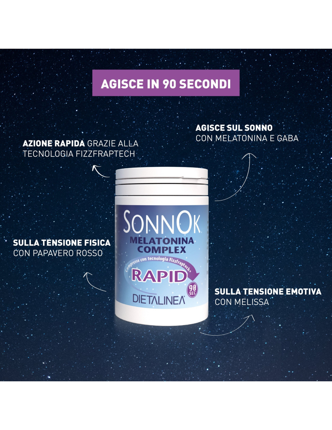 💤 SonnOk Rapid è un integratore alimentare studiato per favorire rilassamento, benessere mentale e qualità del sonno, grazie a una formula che agisce su mente e corpo prima di dormire. Le compresse orosolubili frizzanti si sciolgono rapidamente in bocca, permettendo un assorbimento rapido e pratico senza bisogno di acqua.