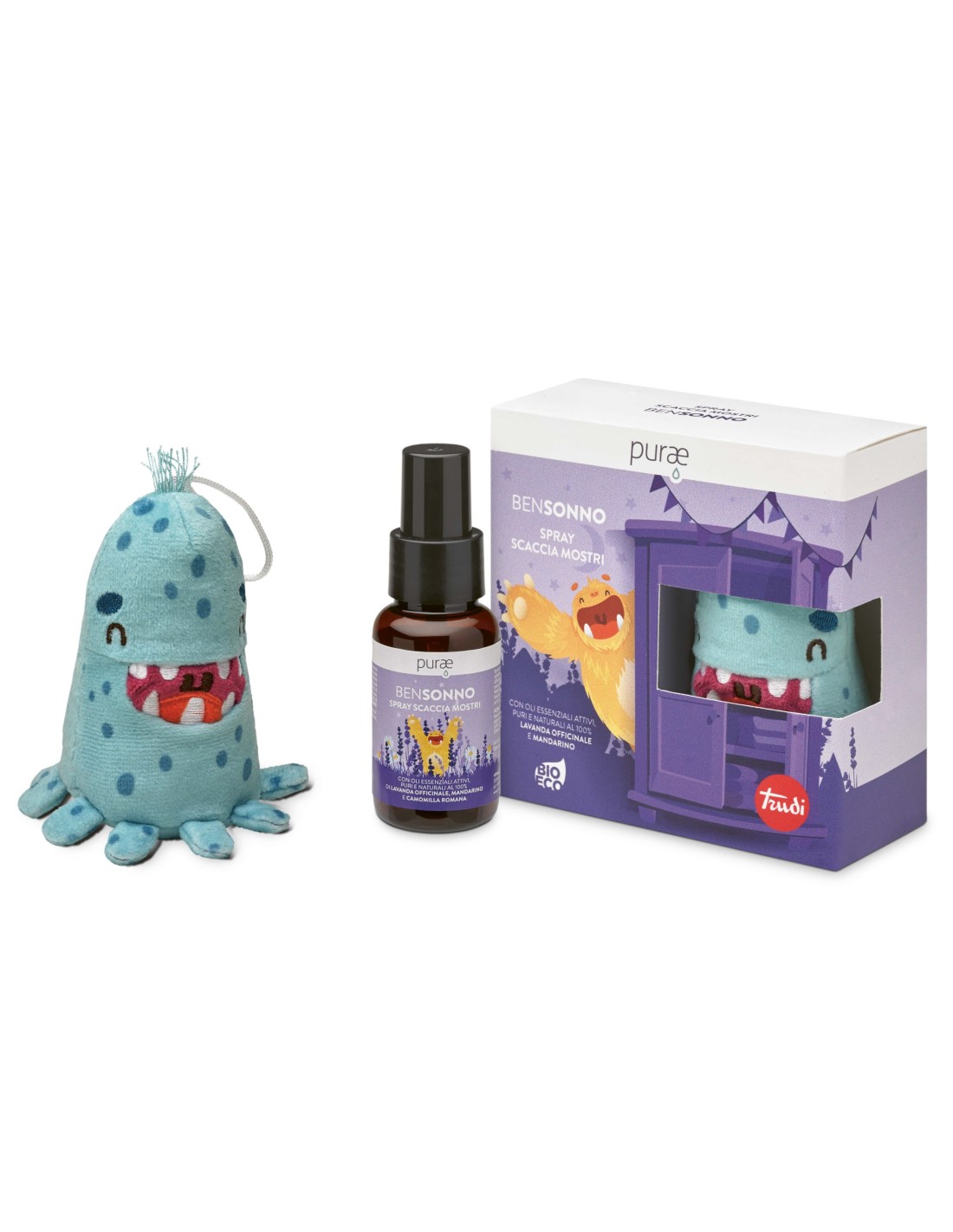MOSTRO IN PELUCHE TRUDI: il mostro buono di Bensonno Scacciamostri prende vita grazie ad una collaborazione d'eccellenza con lo storico marchio di peluche Trudi. Ideale per proteggere i sogni dei più piccoli, in maniera ancora più efficace quando viene profumato con lo spray.